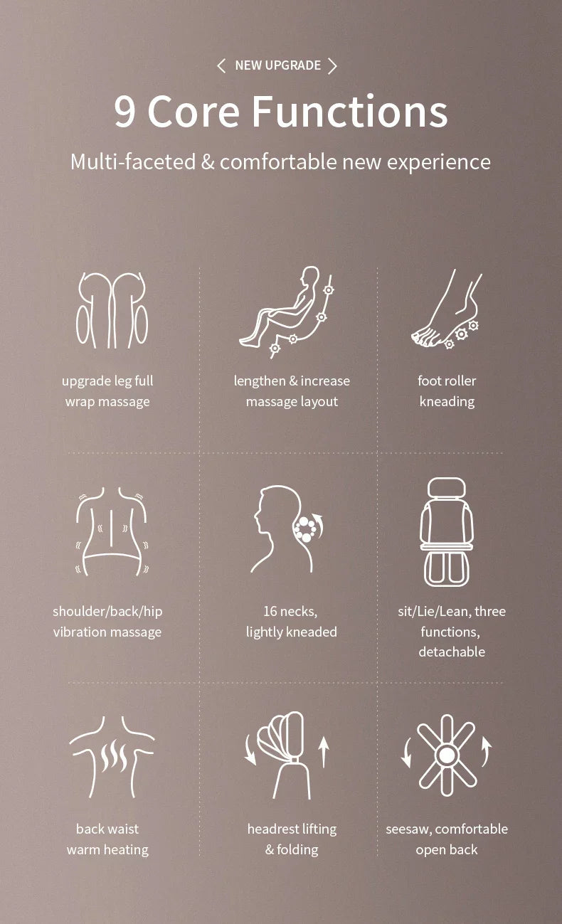 Immerse yourself in relaxation with our Upgrade Electric Massage Chair. Enjoy a full body treatment with infrared heating, vibration, and kneading shiatsu techniques for the neck, back, waist, and legs. Increase circulation and alleviate tension with this advanced massage cushion.